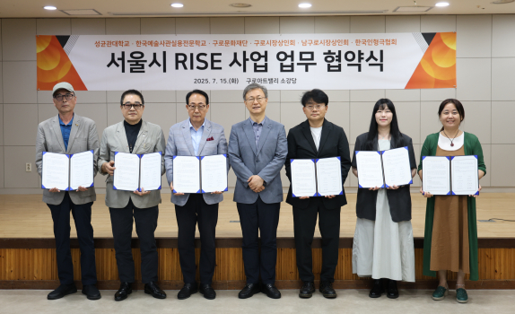 매일일보 = 백중현 기자 | 구로문화재단(대표이사 정연보)이 서울시 지역혁신중심 대학지원체계(RISE) 사업의 ‘지역사회 동반성장 – 지역 현안 문제 해결’ 과제에 성균관대학교와의 협력을 통해 선정됨에 따라 지역 전통시장과 연계한 문화예술 활성화 사업을 본격 추진한다고 17일 밝혔다. 이에 따라 재단은 15일 구로아트밸리에서 성균관대학교, 한국예술사관실용전문학교, 구로시장상인회, 남구로시장상인회, 한국인형극협회 총 6개 기관간의 업무협약(MOU)을 체결하며 그 시작을 알렸다.